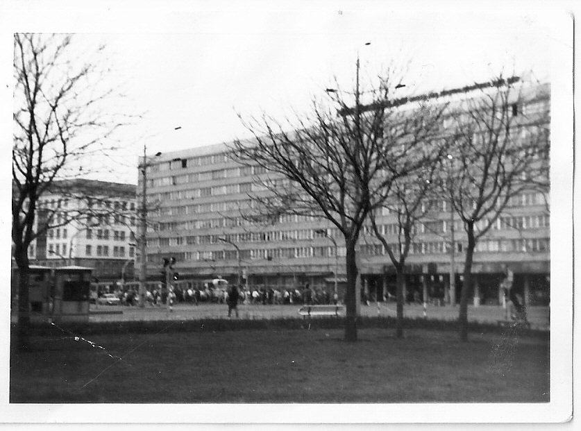 Auf der im Vordergrund sichtbaren Wiese steht heute das Allee-Center, die kahlen Laubbäume sind längst gefällt. Auch die an der Kreuzung Ernst-Reuter-Alle/Breiter Weg haltende Tatra-Straßenbahn ist inzwischen längst Geschichte. Der leider nicht lesbare Schriftzug über dem Gebäude stellte eine Werbung für das „Neue Deutschland“ dar.