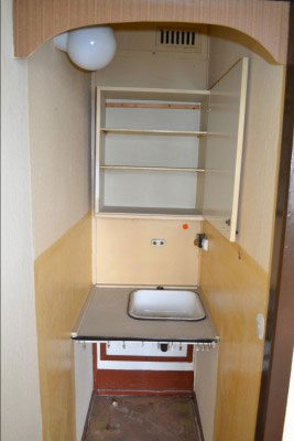 In der Kochnische stand neben der Spüle ein Elektro-Kocher mit einer Platte, darauf wurde im Schnellkochtopf gekocht, der Wäschetopf mit Windeln gekocht (es gab noch keine Wegwerfwindeln), unter der Spüle stand ein 40-Liter-Minikühlschrank.
