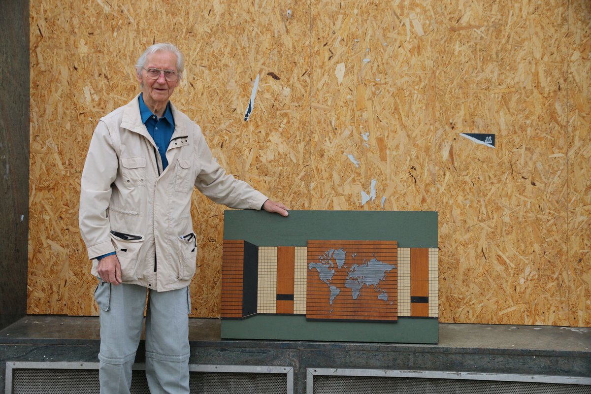 #Die gesuchte Plastik stellt die Kontinente der Erde dar. Sie ist vermutlich vier mal fünf Meter groß. Bruno Groth zeigt zur Anschaulichkeit ein Modell der Plastik im Maßstab 1 : 10. In den Ladenräumen des Blauen Bocks ist sie nicht mehr zu finden.